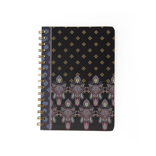 This beautiful Paisley Vibes notebook with ring binder is a combination of colored paisleys and graphic gold check print. This ethnic boho print contains the colors pink, blue, black and green with gold accents. The back is navy blue with subtle light blue stripes. The notebook has pink writing lines and a hard cover with a gold ring binder. This spiral spine fits perfectly with the gold accents on the rest of the notebook.