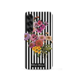 Striped Grace combineert tijdloze zwart-wit strepen met een vrolijk en kleurrijk plukboeket op de voorgrond. De frisse mix van gele, roze, zalmroze en felroze bloemen zorgt voor een speelse en zomerse uitstraling die prachtig contrasteert met de subtiele achtergrond.